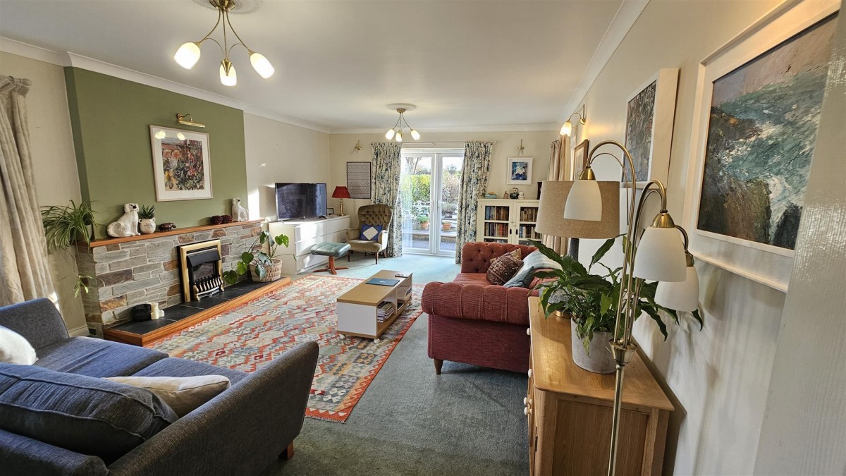Fitted carpet, two double glazed windows to the rear, radiator, three wall lights, views across the garden, double doors into...