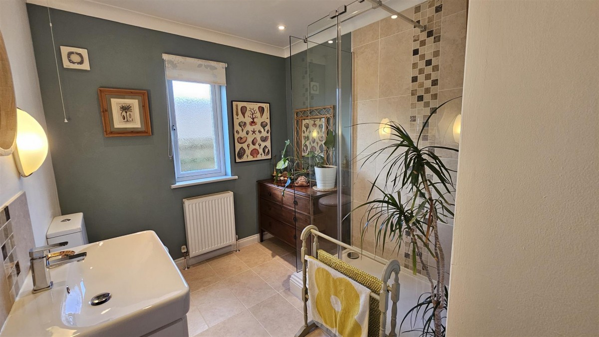 Spacious walk in fully tiled shower cubicle with glass screen, mains fed rainfall shower, drencher head and separate wand attachment. Tiled floor, low level w/c with push button flush, radiator, wash hand basin with vanity unit below, tiled splash back, inset ceiling spot lights, double glazed window to the side.
