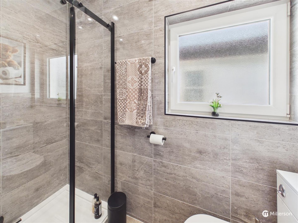 Recently refurbished shower cubicle with electric shower and glass door. Low level W/C, pedestal wash hand basin, tiled splash back, vinyl flooring, tiled walls and ceiling and window to side aspect, extractor fan.