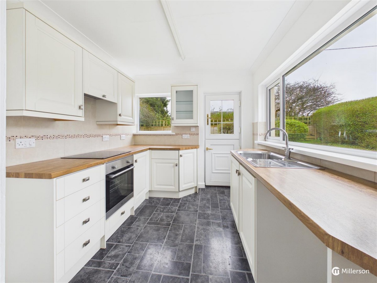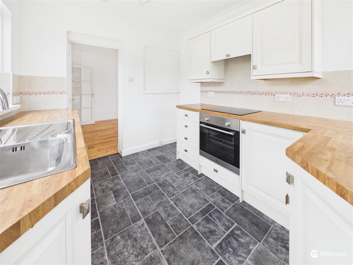 Fitted with a selection of cream coloured shaker style base and wall mounted units with wood effect work surfacing over. Stainless steel sink and drainer with mixer tap, space for fridge freezer and washing machine. Four ring electric hob with oven below, double glazed windows to two sides, tile effect flooring, door to rear, leading onto garden.