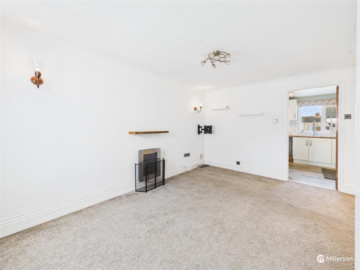 Fitted carpet, double glazed window to the front, two wall lights, gas fire, understairs storage cupboard, glazed panel door into...