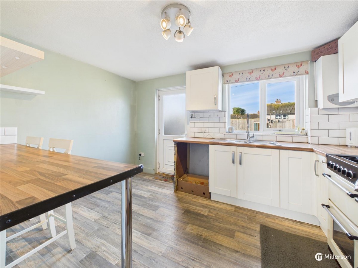 Built in breakfast bar, with tiled splash back, vinyl, wood effect flooring, ceiling mounted spot lights, door to the rear, leading onto rear garden.
