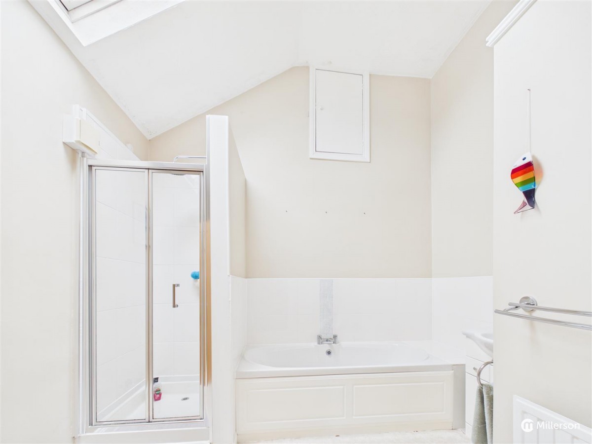 Fitted with a white suite comprising, panel enclosed bath with mixer tap, tiled surround, wash hand basin with vanity unit below, radiator, shower enclosure with mains fed shower, tiled surround, and bifolding glass doors.