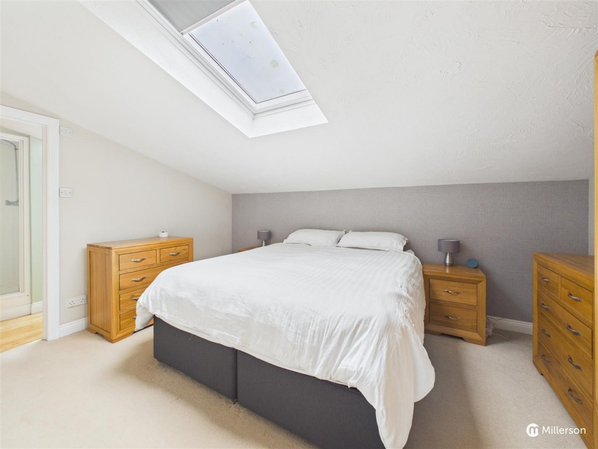 Fitted carpet, sloping ceiling with fitted roof light, radiator, door into...
