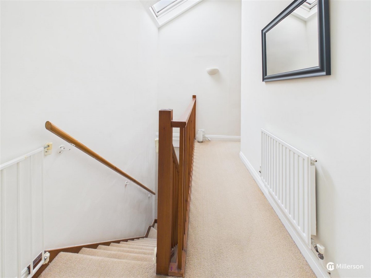 Fitted carpet, sloping ceiling with built in roof light, wall light, radiator, built in airing cupboard, various doors leading off.
