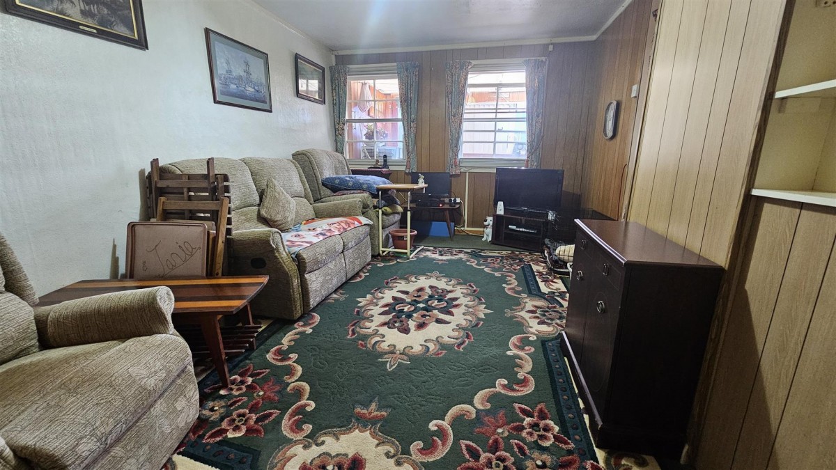 Fitted carpet, 2 sash internal windows to the rear into sunroom, part panelled walls, recessed shelving, electric night storage heater, open into...