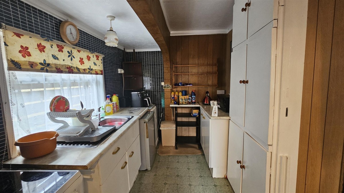 Fitted with a selection of base units with roll top work surfacing over, stainless steel sink and drainer, window to the side, space for cooker, fridge and freezer, Part tiled walls, loft access, vinyl flooring, built in cupboards, open into...