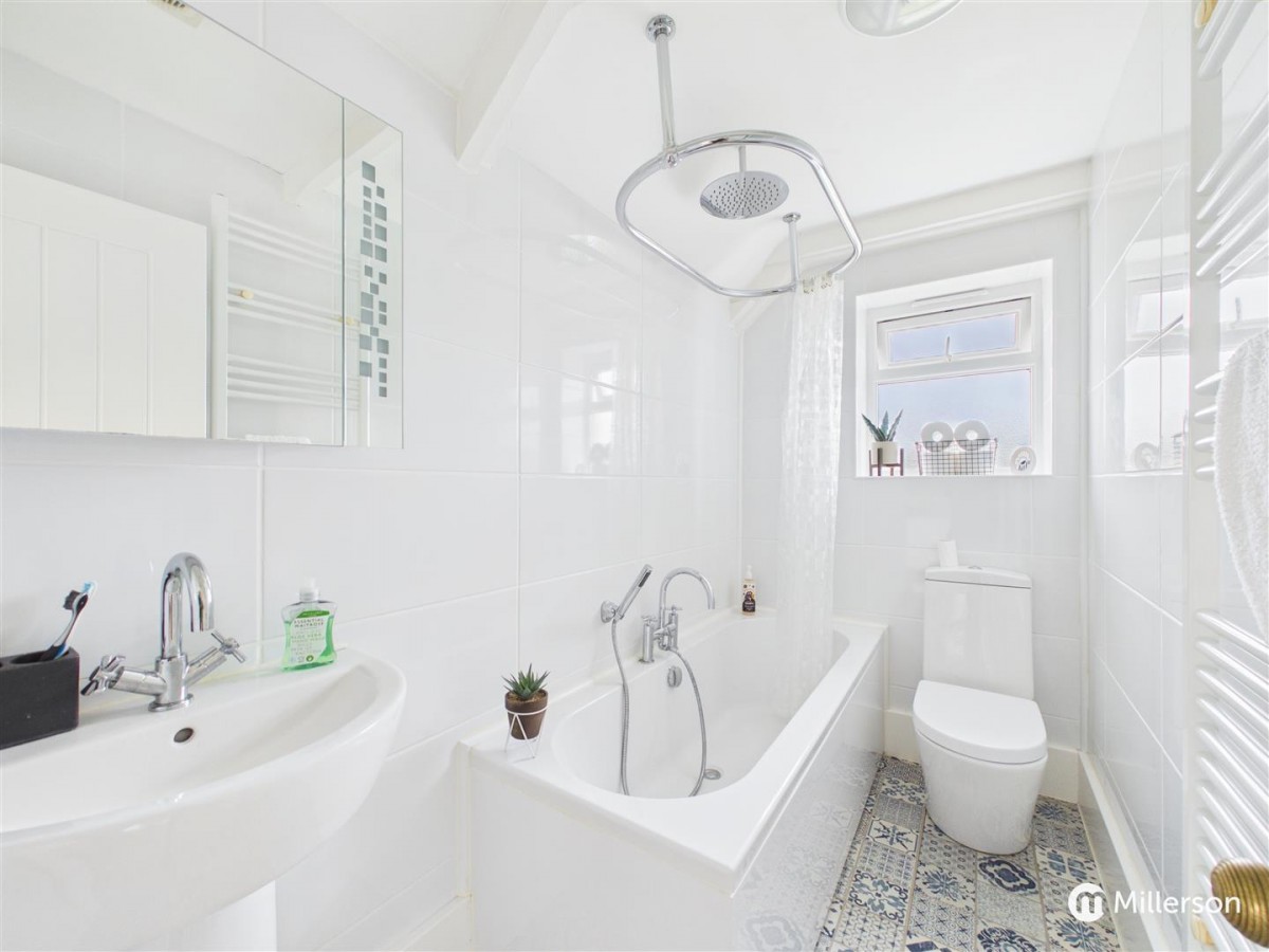 A really beautifully finished bathroom suite with Ceramic tile effect laminate flooring. Panelled bath with ceiling mounted fully plumbed rainfall shower with circular screen. Pedestal wash hand basin. Low level W.C. Fully tiled to four walls. Mirrored medicine cabinet. Wall mounted heated towel rail. UPVC double glazed obscured window to side elevation.