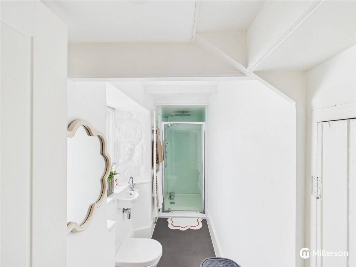 A beautiful ground floor shower room with slate effect ceramic tile flooring. Enclosed shower cubicle with plumbed shower unit over. Wall mounted wash hand basin. UPVC double glazed obscured window to side elevation. Wall mounted heated towel rail. Exposed white washed stone walls.