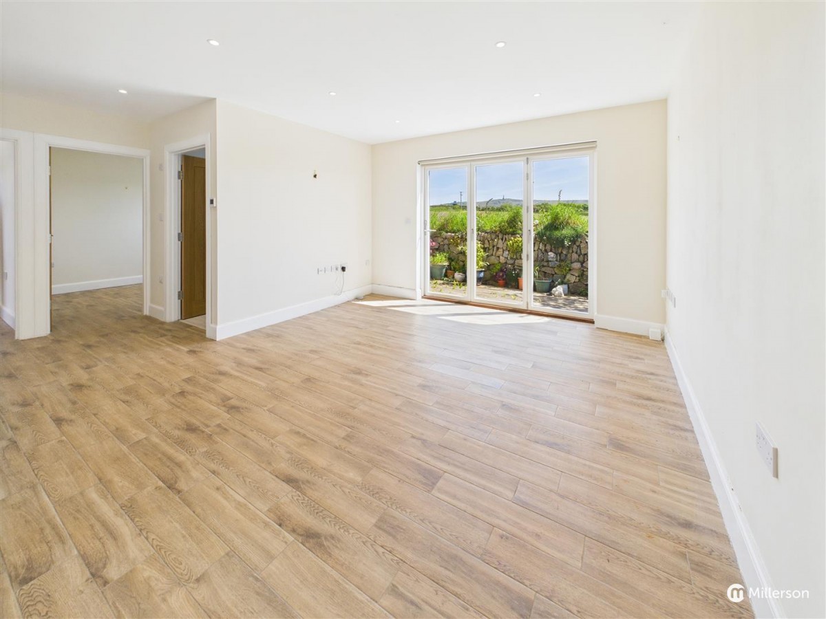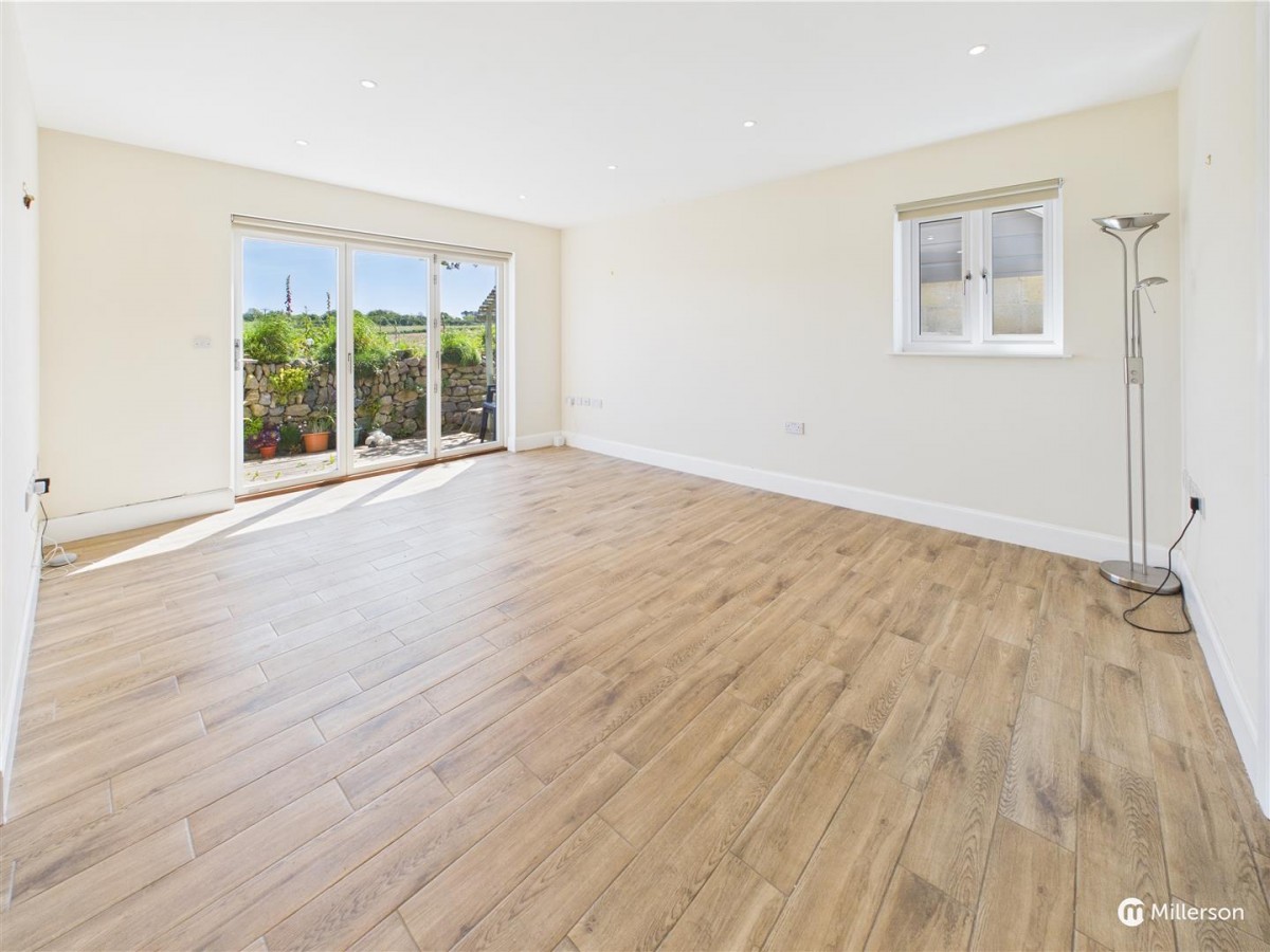 A large, light and airy dual aspect living space with bifold patio doors and open countryside views, double glazed window, wood effect tiled flooring with underfloor heating, inset lighting, oak internal doors to kitchen, utility, shower room and second bedroom.