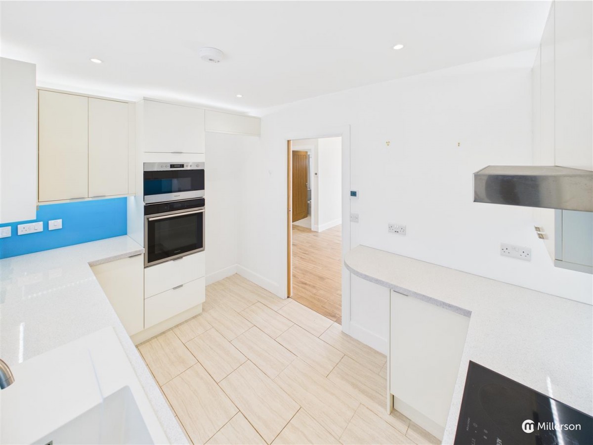 A well appointed kitchen fitted with a range of matching gloss units and polished stone worksurfaces, under and over cabinet lighting, integrated induction hob, extractor hood, double oven, composite sink, double glazed window, spaces for dishwasher and fridge/freezer, tiled flooring with underfloor heating.