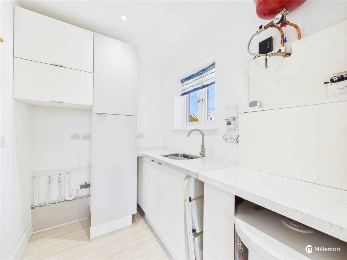 A useful utility room with space and plumbing for washing machine, stainless steel sink with mixer tap, water heater, fitted cupboards.