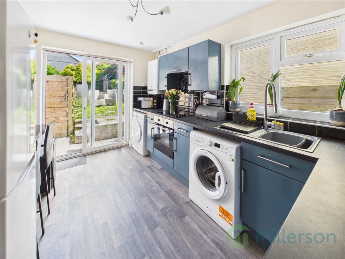 A modern fitted kitchen with a range of matching base and wall units, granite effect work surfaces with tiled splash backs, Integrated electric oven, hob and extractor , stainless steel sink with mixer tap and drainer spaces for washing machine, tumble dryer and fridge freezer, wood effect flooring space for small table and chairs, wall mounted 'Baxi' combination boiler, radiator, double glazed window and sliding patio doors opening onto rear garden.