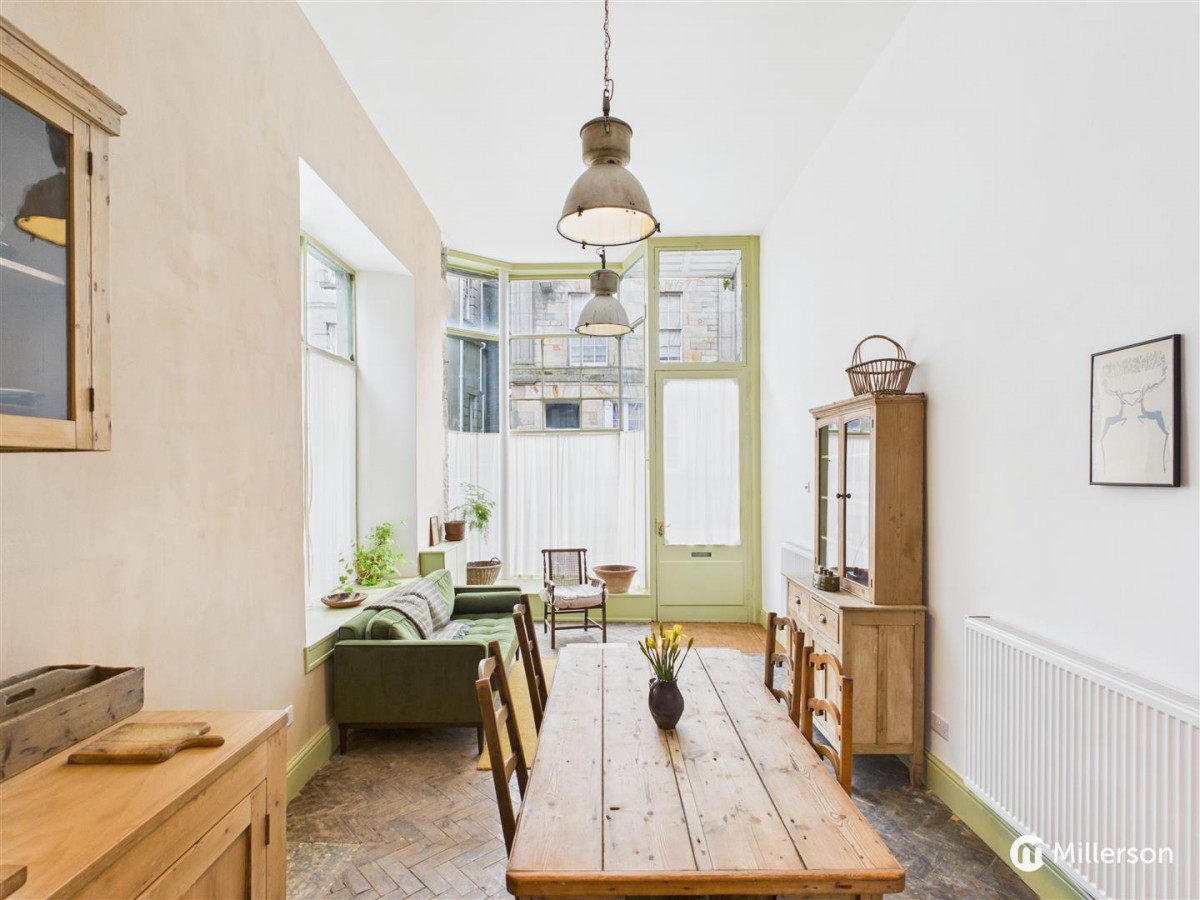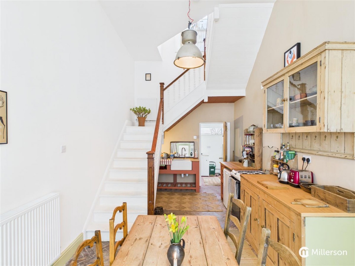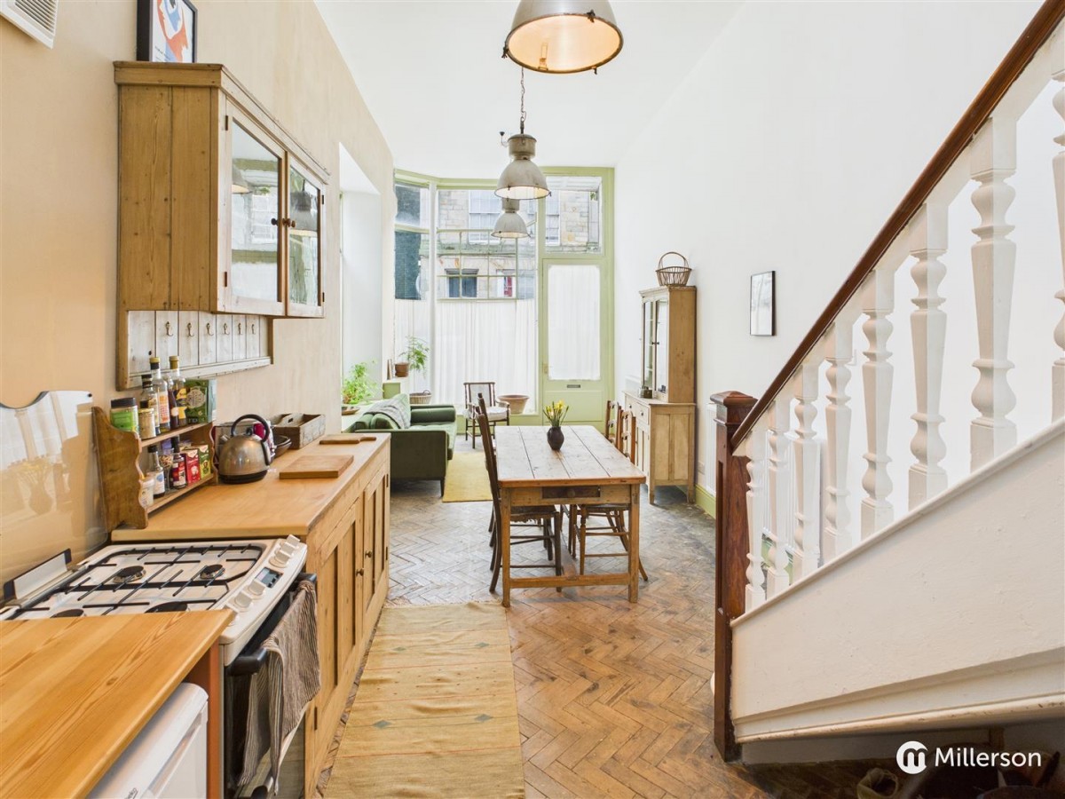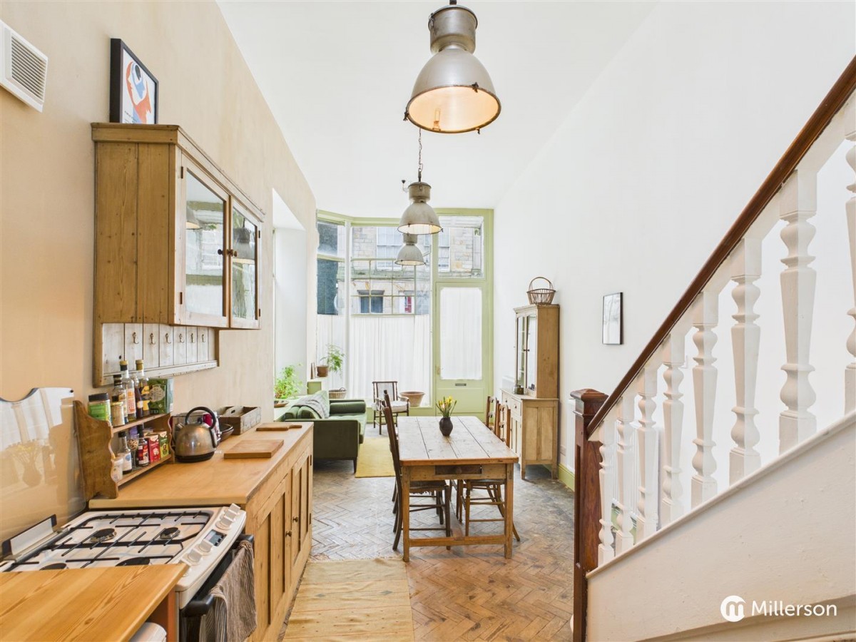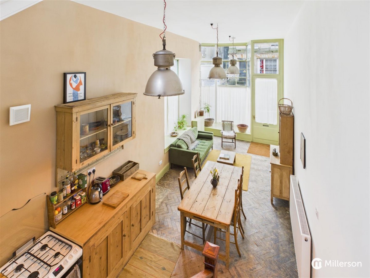This beautifully presented open-plan living and dining area offers an impressive sense of light and space, enhanced by high ceilings and a large original bay window with glazed door, allowing natural light to flood the room. This open space comfortably accommodates both a dining table and a relaxed seating area, making it an ideal entertainment space. Characterful features such as herringbone-style Parquet flooring and statement industrial pendant lighting work superbly well with the impressive proportions of the room. A turning staircase rises to the first floor from the Dining area.