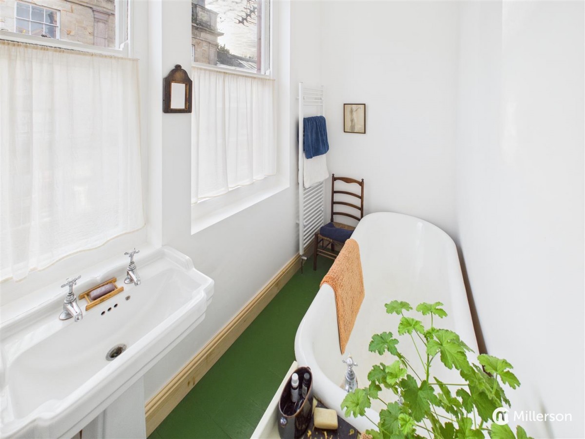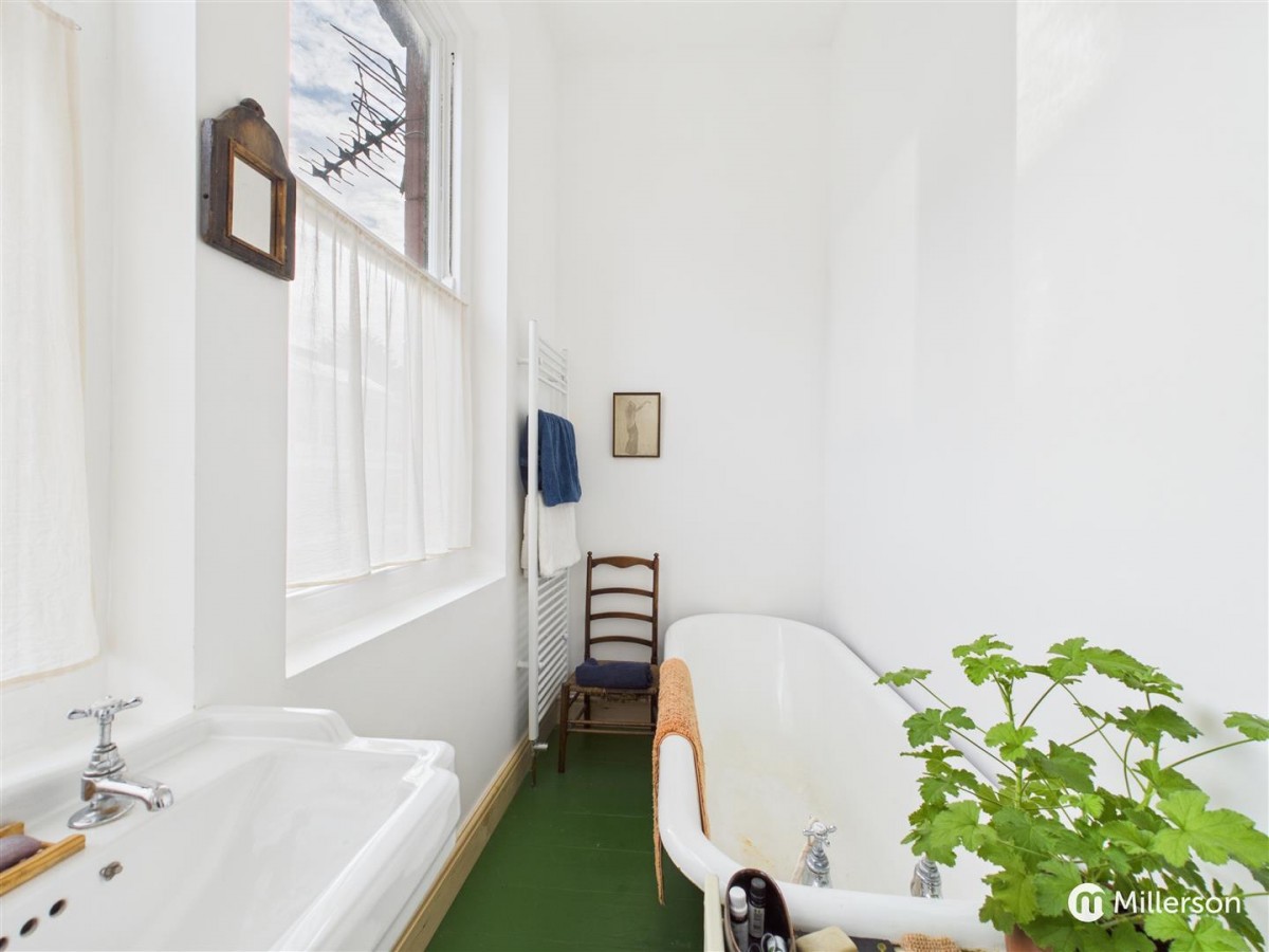 A beautiful bathroom, full of natural light, with an impressive free standing Roll top claw foot bath. Two original sliding sash windows to front elevation. Pedestal wash hand basin. Wall mounted heated towel rail. Painted timber flooring.