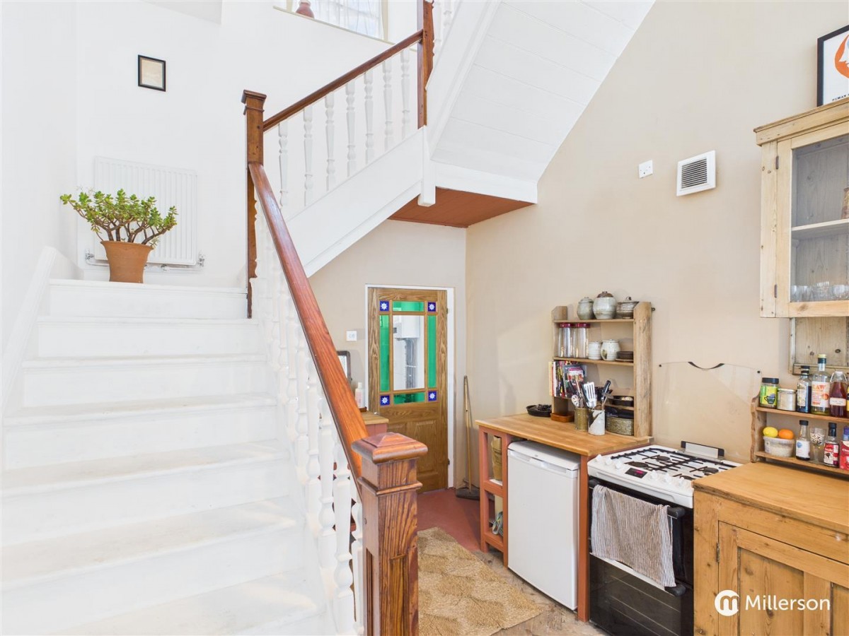 A quite spectacular period turning staircase leads up to the first floor window with sliding sash glazed window to real elevation. There's a small landing with door opening into: