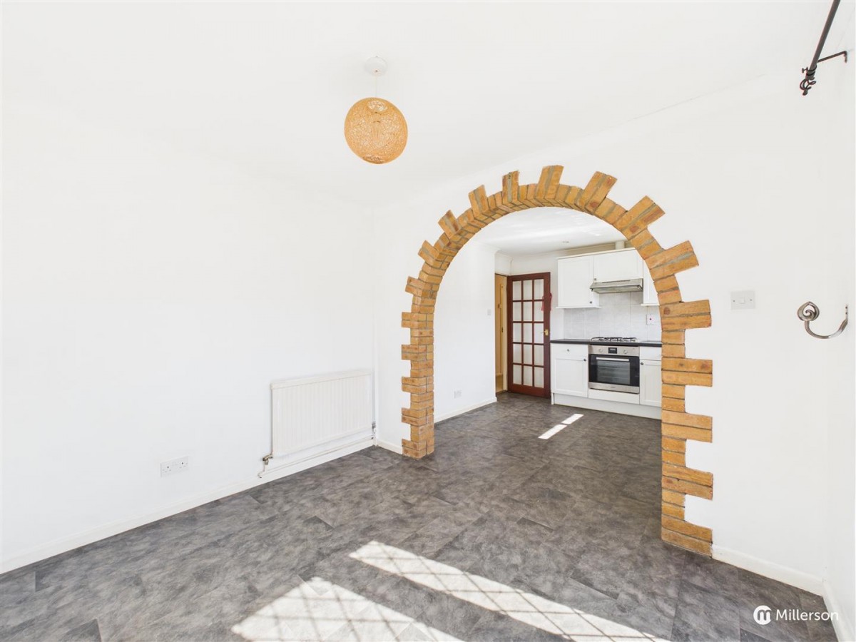 A light and bright kitchen with brick archway separating the dining space. patio doors to rear garden, radiator, tile effect flooring, a range of matching base and wall units with granite effect work surfaces, tiled splash backs, integrated electric oven with gas hob and extractor hood over, stainless steel sink with mixer tap and drainer, inset lighting, double glazed window.