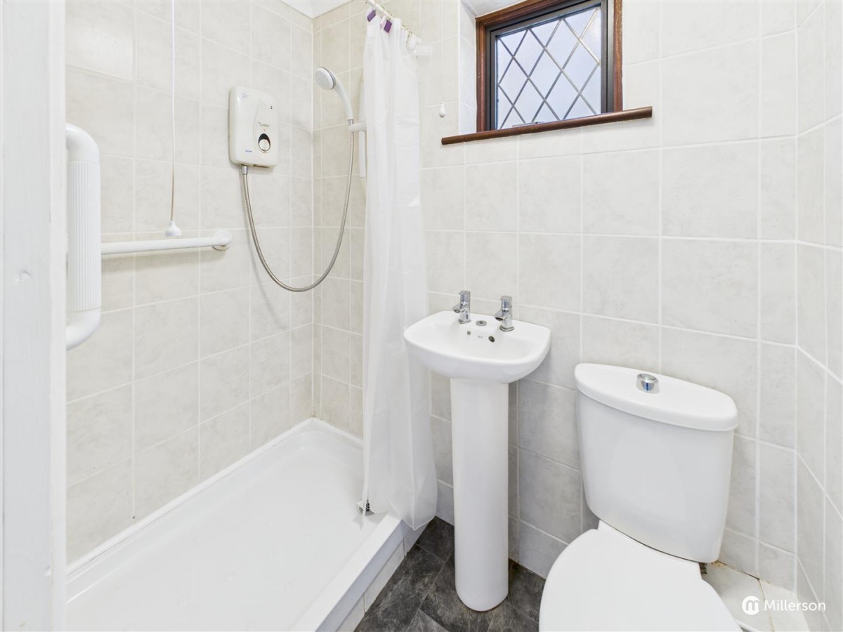 A three piece shower suite comprising shower cubicle with electric shower, W.C and hand basin, tiled walls, tile effect flooring, obscure double glazed window