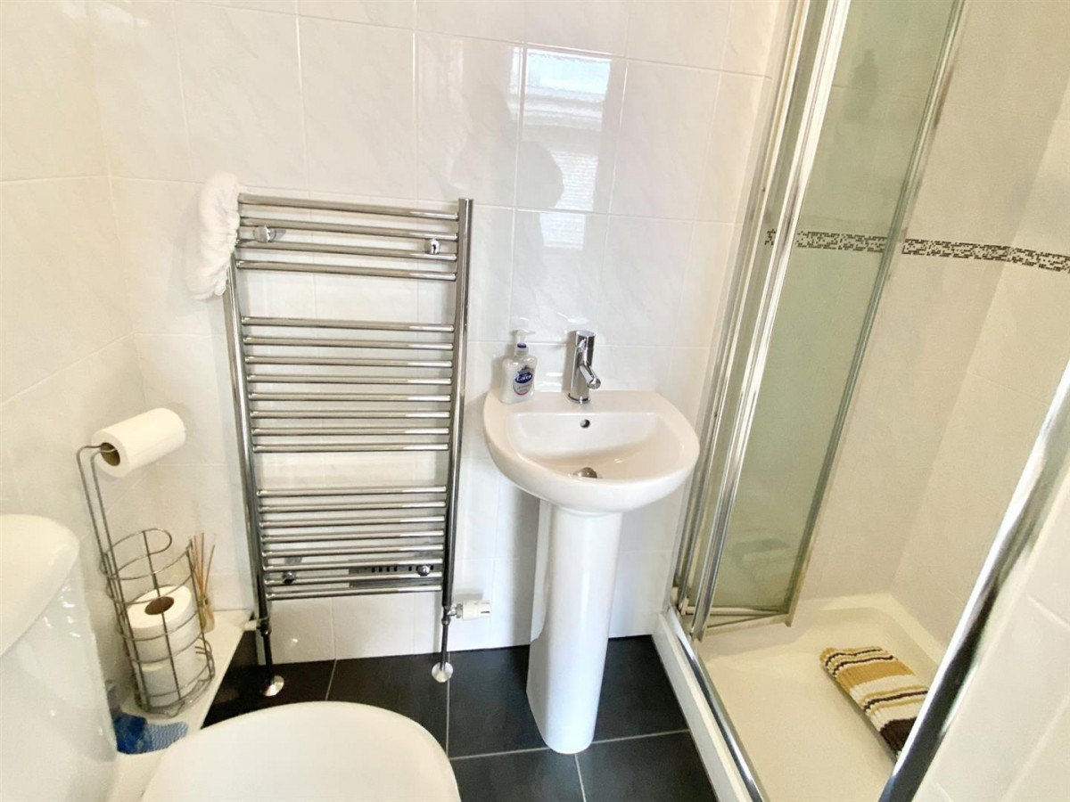 Tiled effect flooring. Dual flush low level W/c. Pedestal hand wash basin. Shower with shower head above of the mains. Heated ladder towel rail.