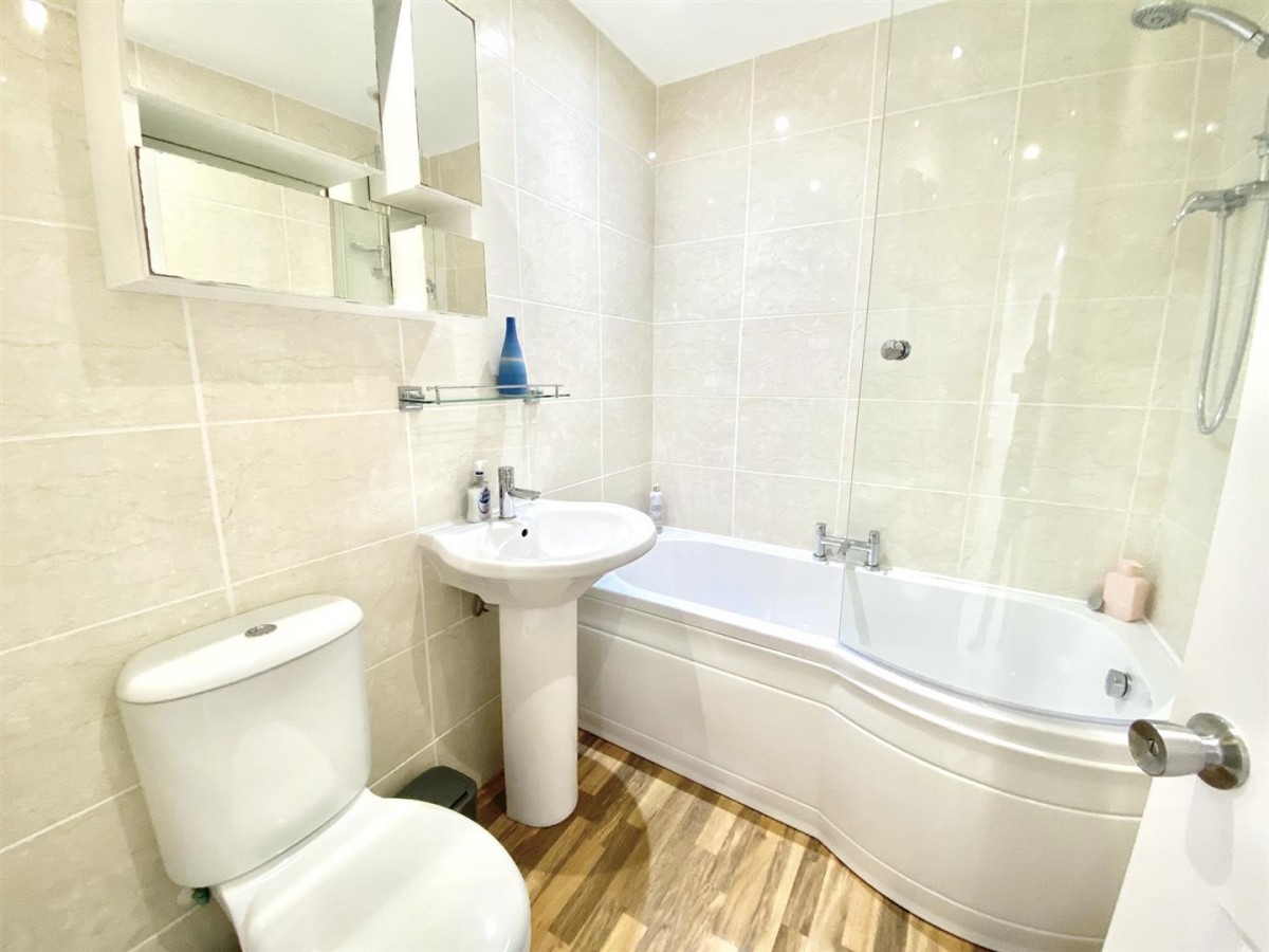 Vinyl flooring. Dual flush low level W/c. Pedestal hand wash basin. Bath with shower above of the main and shower screen to side. Extractor fan. Tiled splashbacks and surrounds. Ladder towel rail.