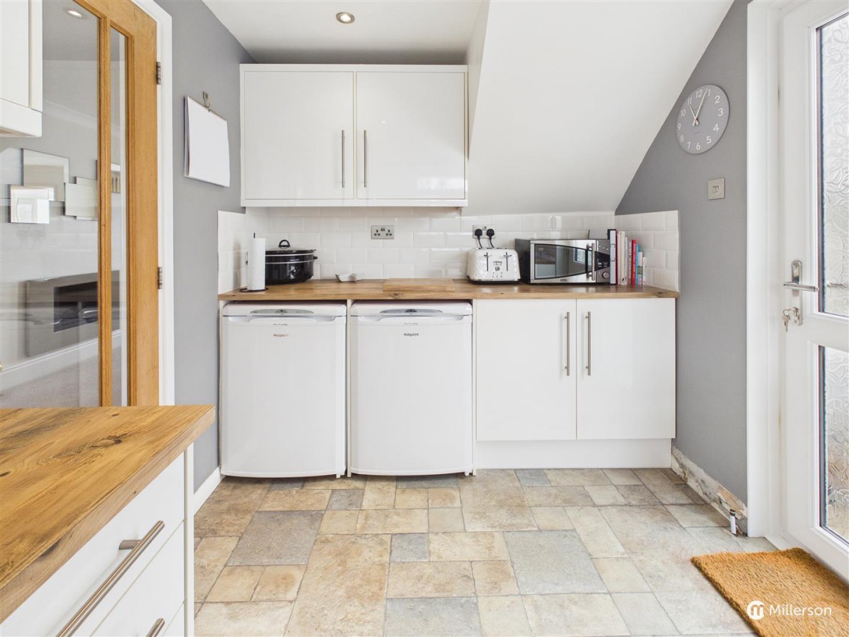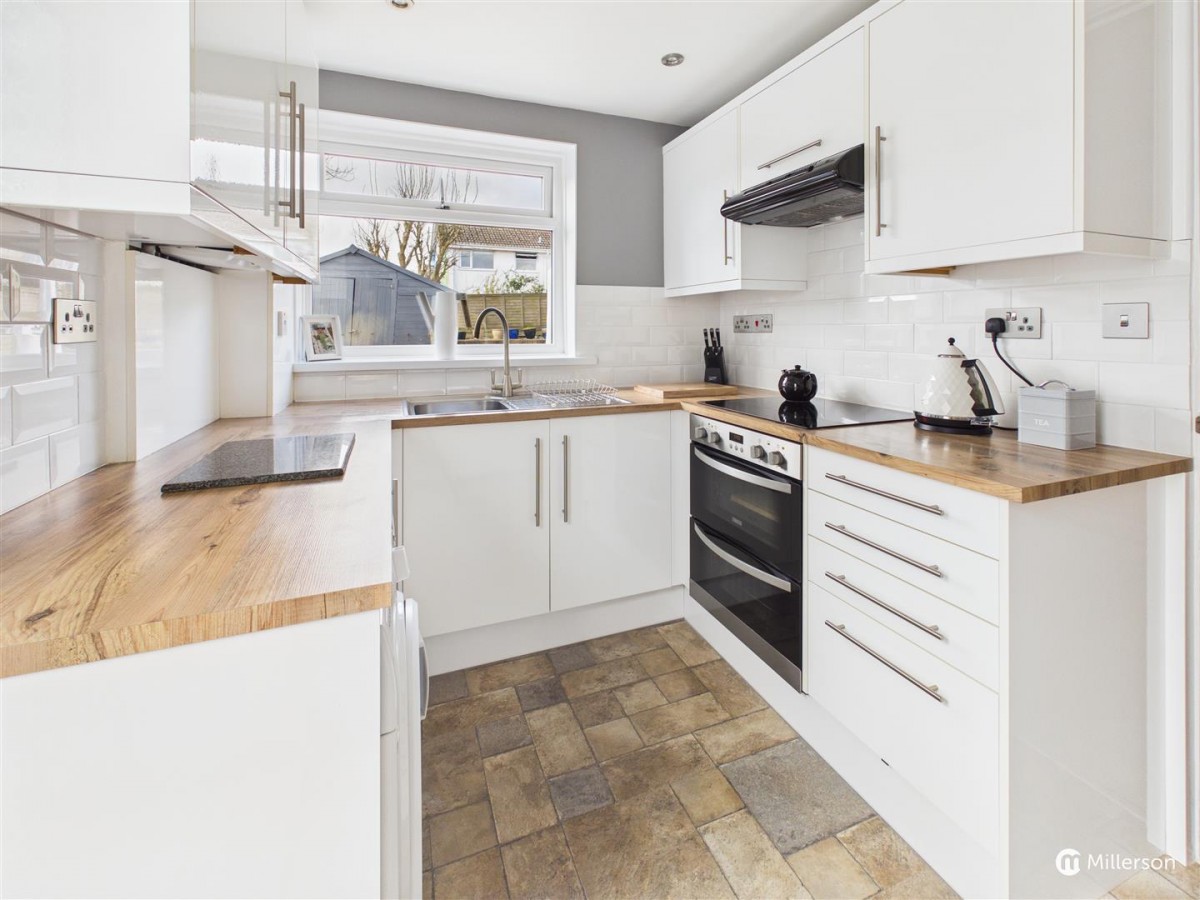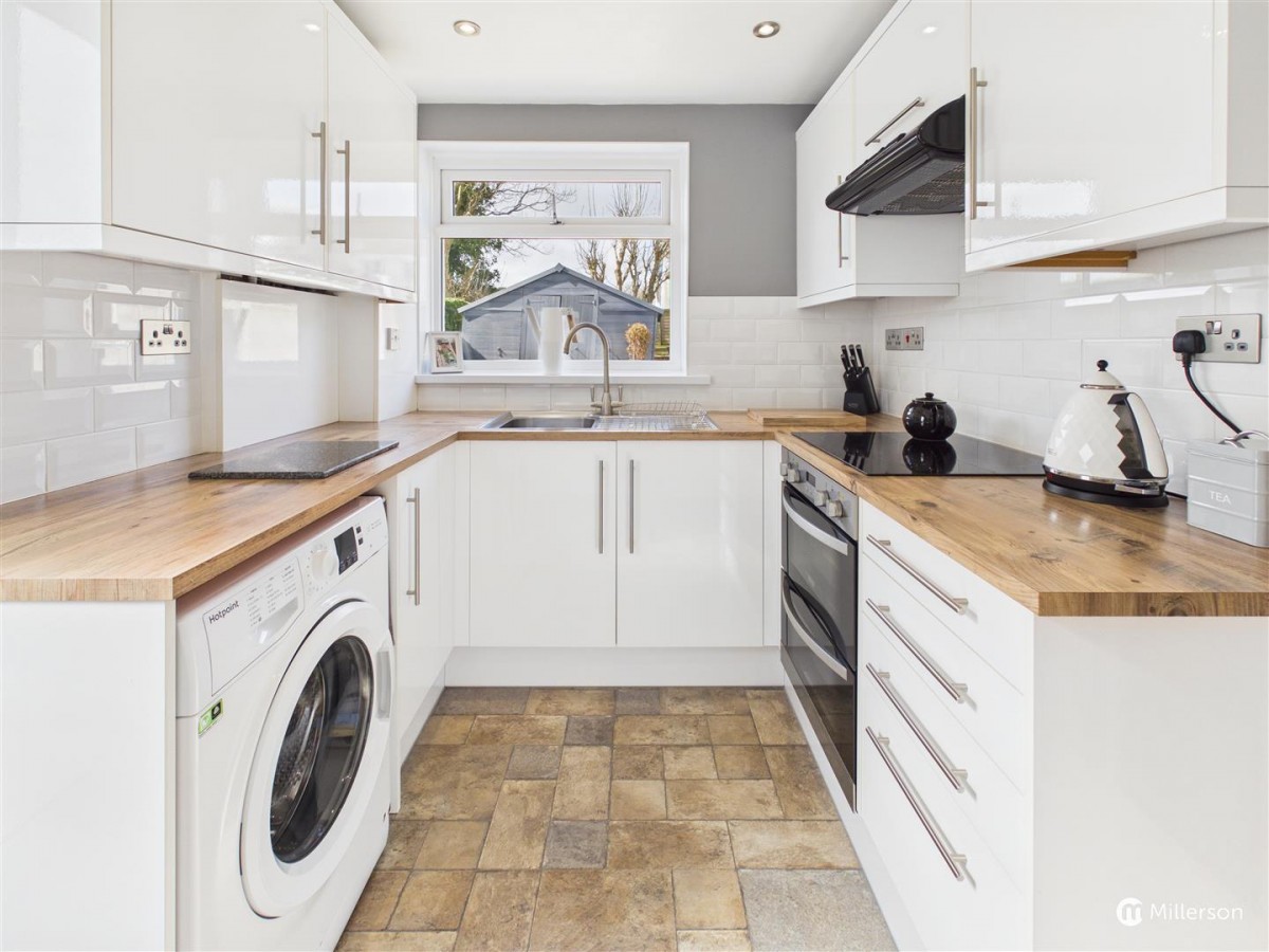 Double glazed window overlooking rear garden. Double glazed door to rear. Fitted with a range of White high gloss wall, base and drawers units with wood effect work surfaces over. Inset stainless steel sink unit and drainer with mixer tap over. Built in electric oven and hob with extractor fan over. Space and plumbing for washing machine. Under counter space for fridge and freezer. Inset ceiling spotlights. Vinyl flooring.