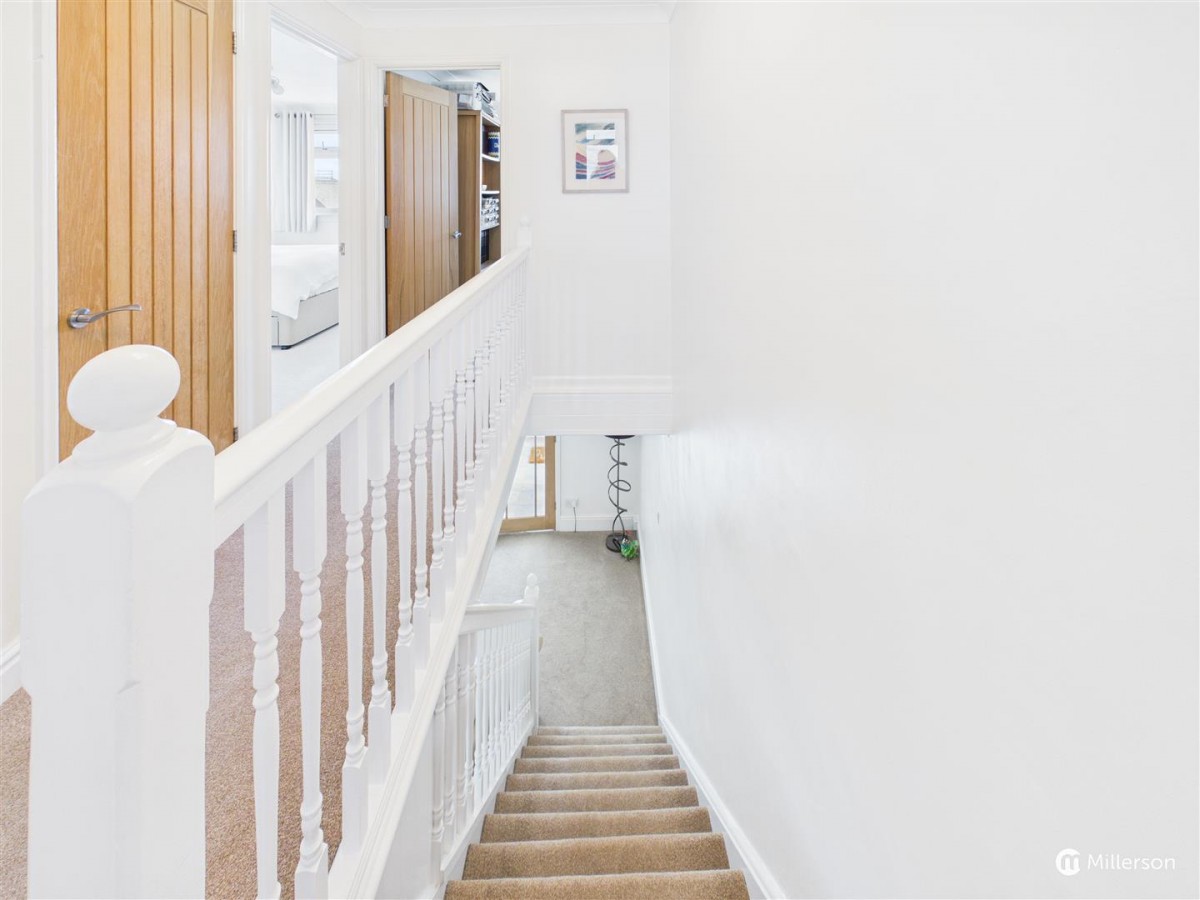Painted, wooden spindles and balustrade. Access to fully boarded loft space. Storage cupboard. Doors off to shower room and bedrooms.