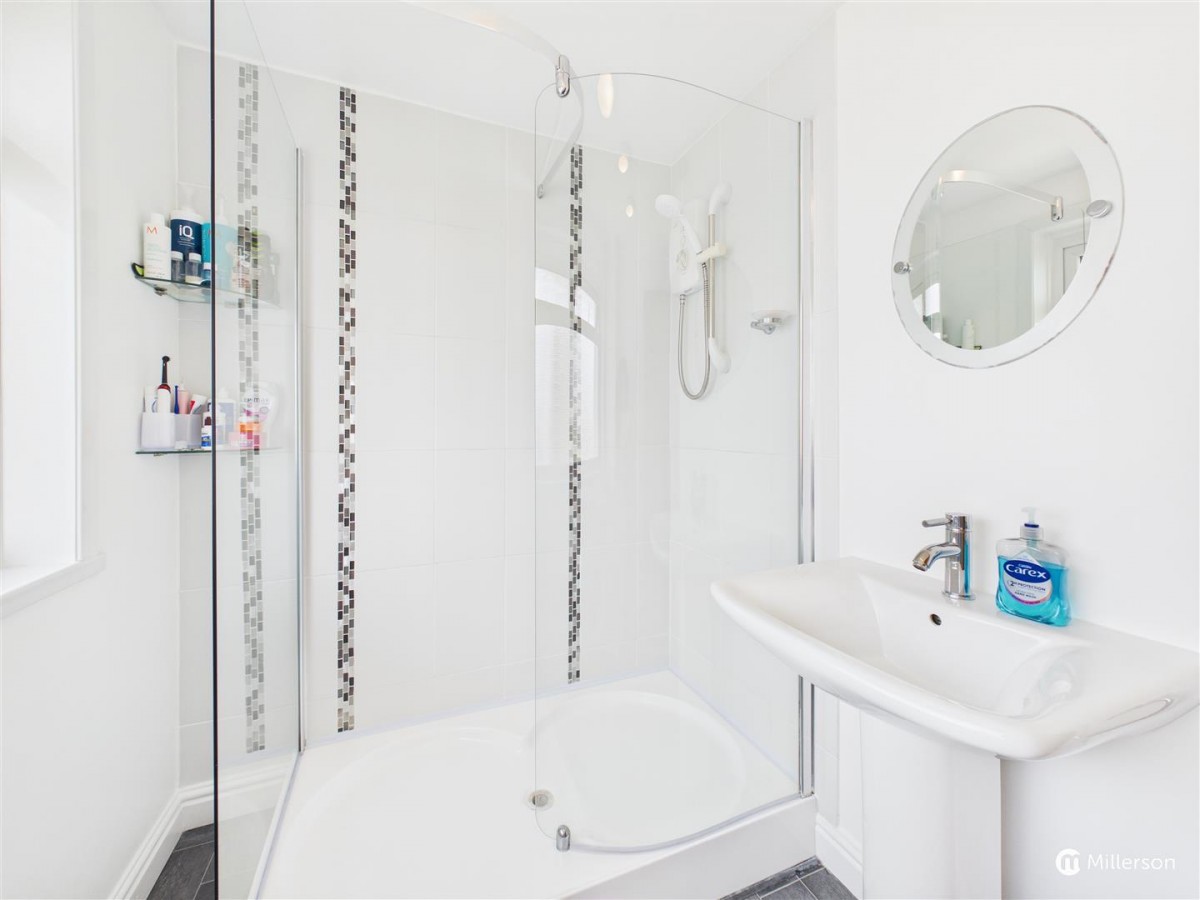 Large obscure double glazed window to rear. Large, fully tiled shower cubicle with glazed screens and fitted electric shower. Oblong pedestal wash hand basin with mixer tap. Low level WC. Corner glass shelving. Towel rails. Vinyl flooring.