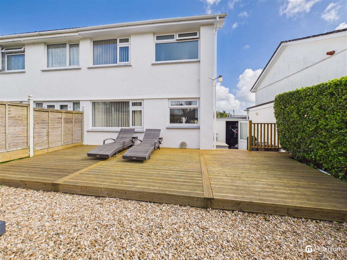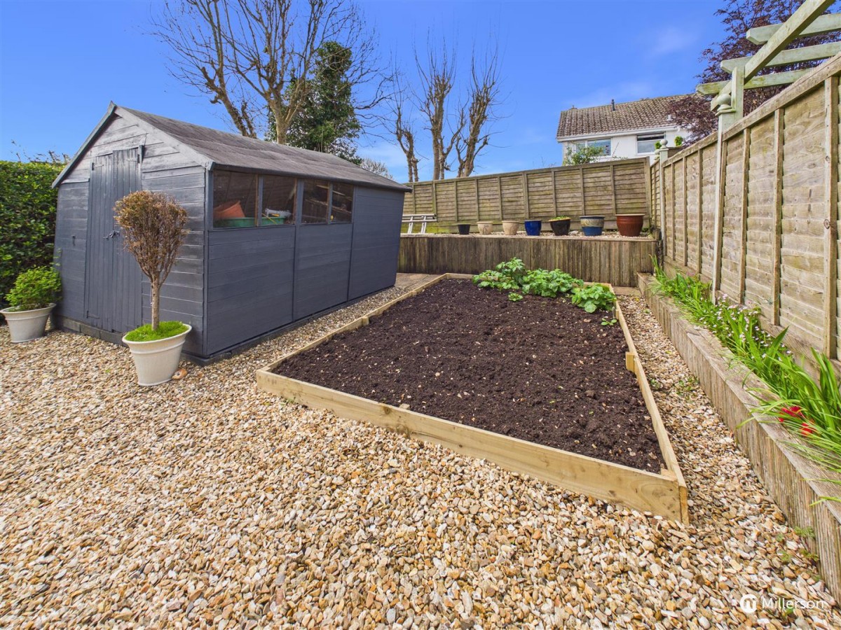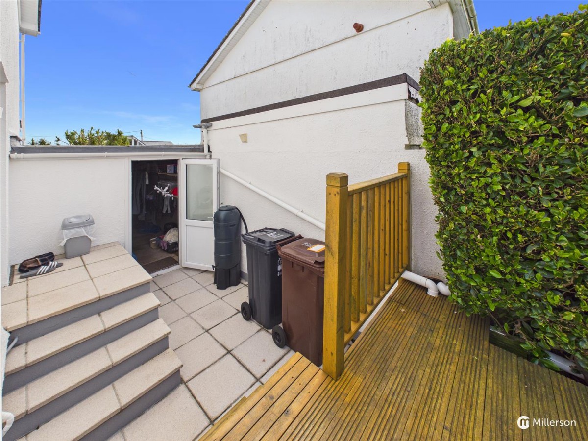 Accessed from the kitchen. Steps down to a small paved courtyard suitable for bin storage. Double glazed pedestrian door to garage. Wooden steps up to enclosed garden area. Wooden decked patio suitable for table and chairs. Timber garden shed. Laid to shingle with raised planters. Enclosed by fencing and hedging. Outside tap.