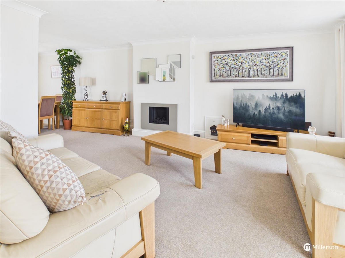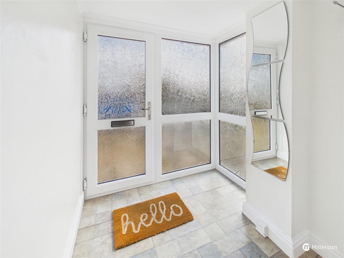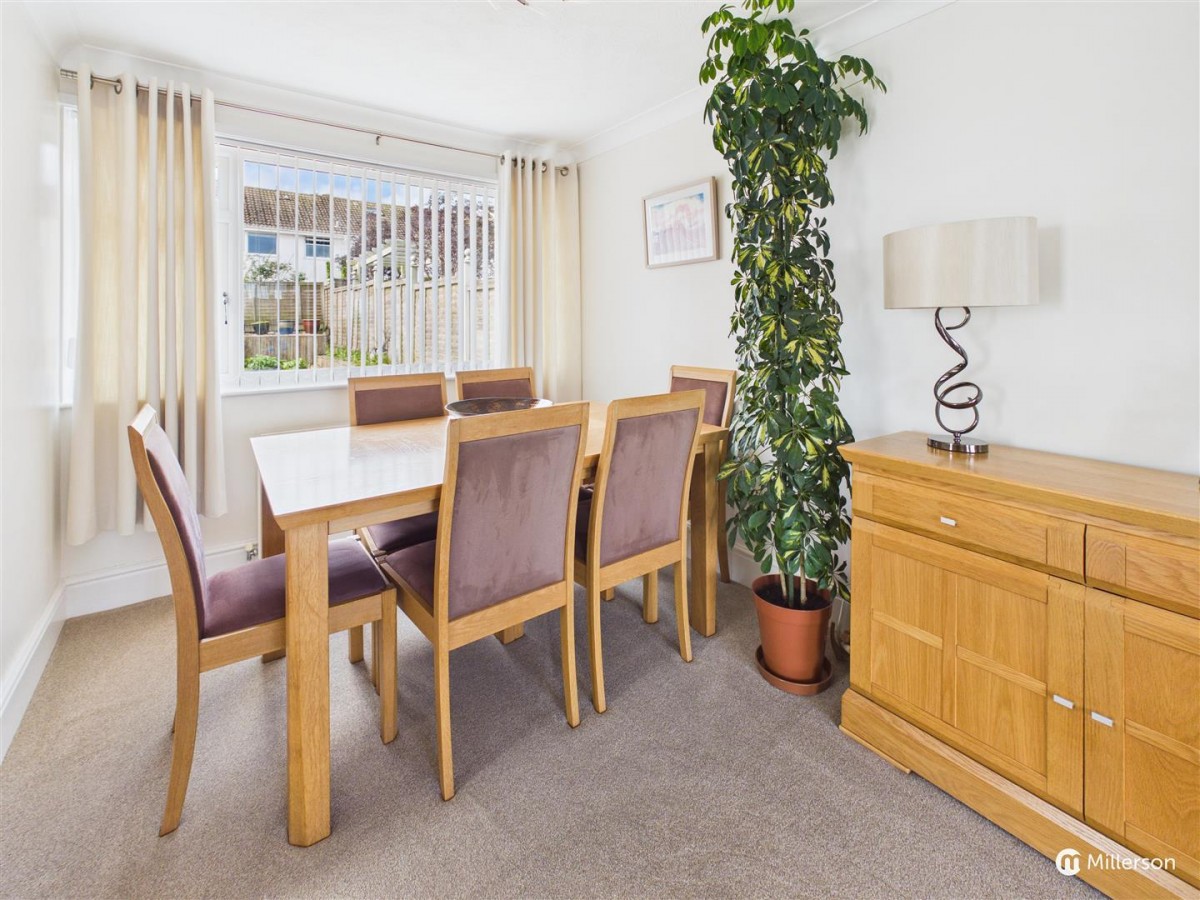 The front garden is designed for low maintenance, being predominantly laid to shingle with space for pots and planting. Paved driveway with parking for one vehicle leads to garage. Steps up to front door.