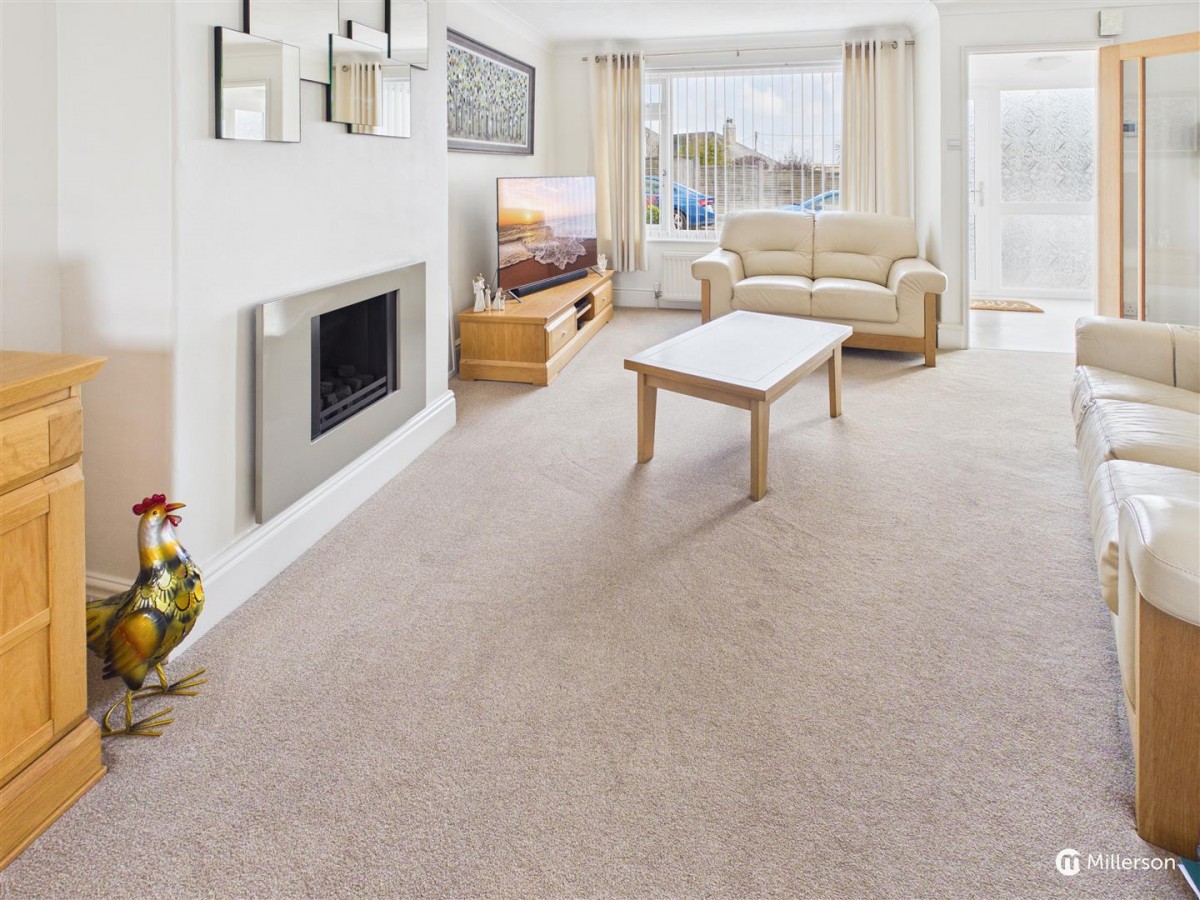 A light and airy dual aspect room. Double glazed windows to front and rear. Coal effect gas fire. Two radiators. Stairs rising to first floor. Door into....