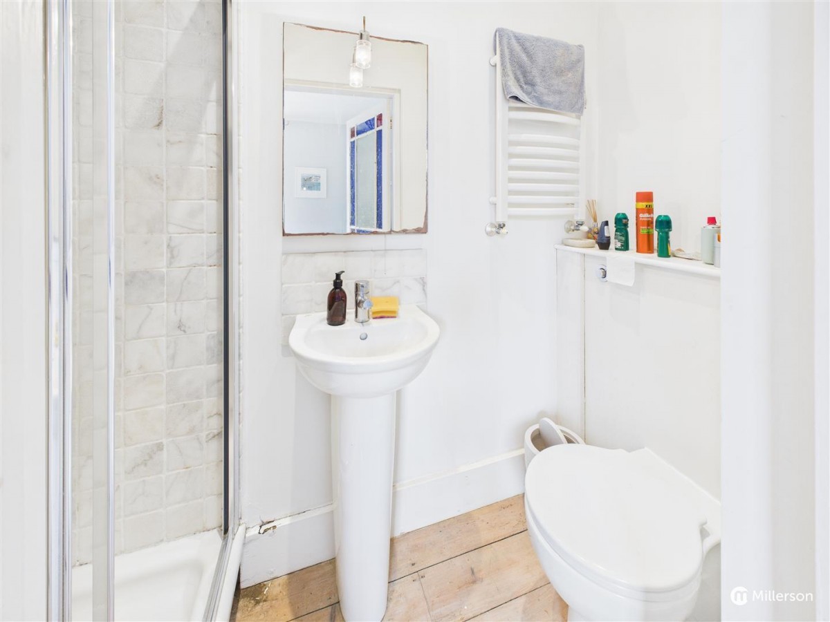 Exposed floor boards, radiator, built in wardrobe, wooden sash window to the front offering delightful into the bay.