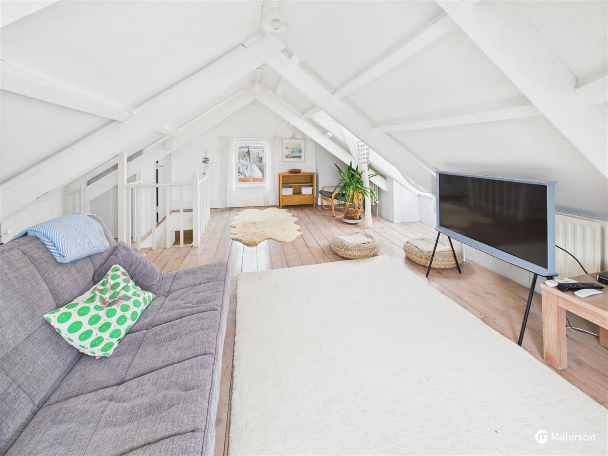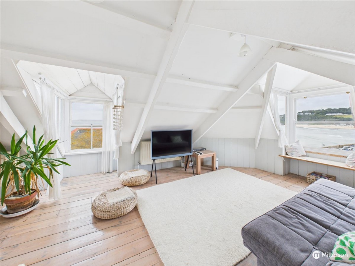 Wooden flooring, two radiators. Triple aspect sash windows with two offering some of the finest views of St Ives Harbour and the bay, across to Gwithian and Hayle. Exposed 'A' frame ceiling beams, and useful storage into the eaves.