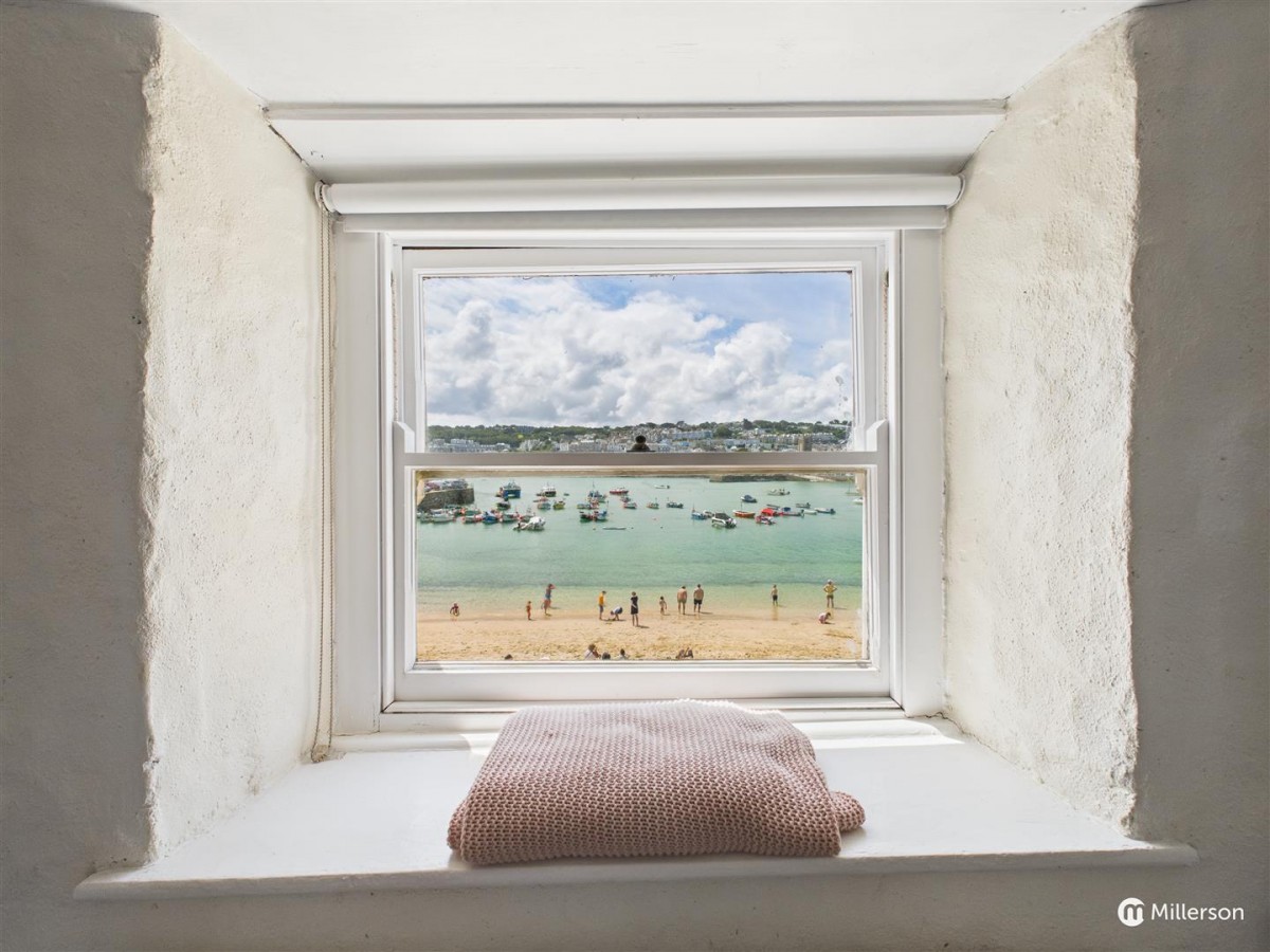 Exposed floor boards, recess with space for freestanding wardrobe, wooden sash window to the rear enjoying stunning views into the Harbour of St Ives and beyond to Porthminster point and Hawkes point.