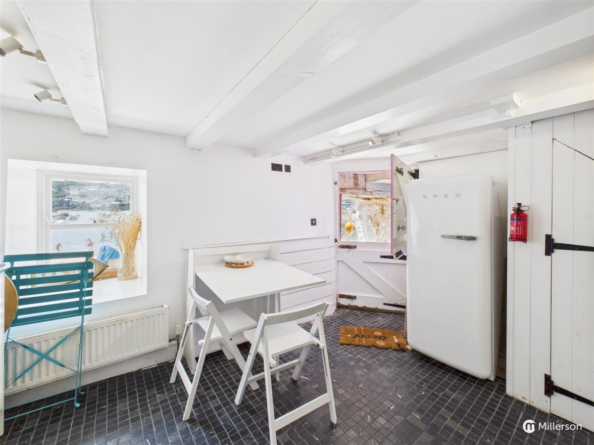 Tiled flooring, beamed ceiling. Sash window to rear aspect offering the stunning view into the Harbour of St Ives and beyond to Porthminster point.